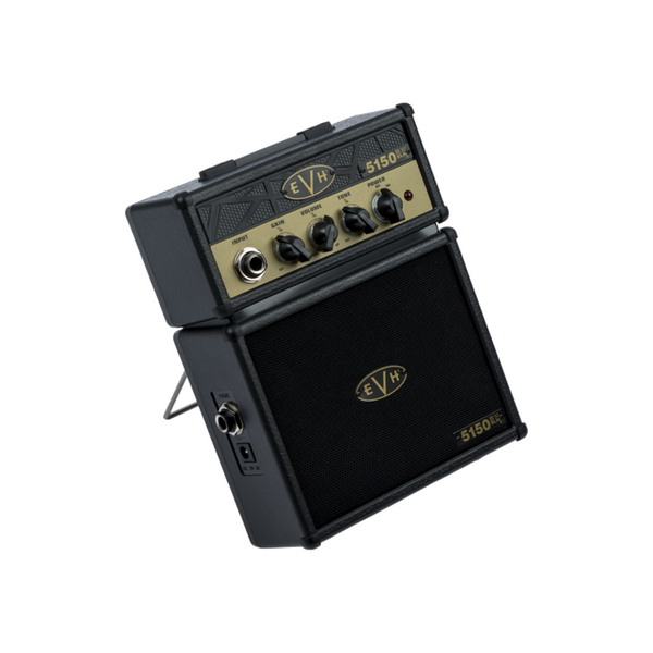 Micro Stack EVH negro y dorado. Cuenta con un altavoz de 3", 1 vatio de potencia y salida de auriculares de 1/4". Batería de 9v incluida.