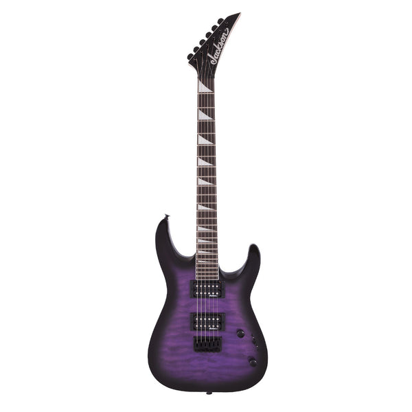 Con un estilo deportivo clásico de Jackson, el JS Series Dinky Arch Top JS32Q DKA HT está decorado con los nuevos acabados Transparent Black Burst, Transparent Green Burst y Transparent Purple Burst con cabezales negros puntiagudos y herrajes completamente negros.