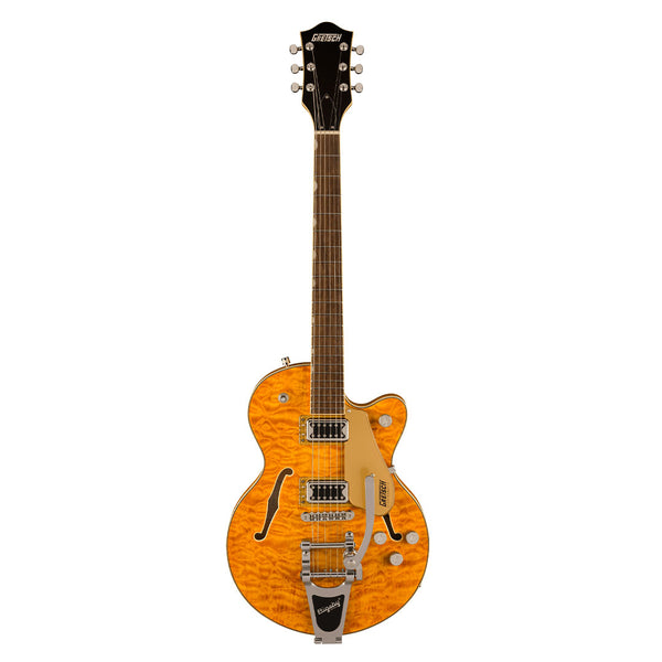 El G5655TQM Electromatic Center Block Jr. Single-Cut con Bigsby® presenta un cuerpo de tamaño más pequeño con una impresionante tapa, fondo y aros de arce acolchados y un bloque central de abeto con cámara para resonancia dinámica, potencia de alta ganancia y comodidad liviana. Un mástil de arce de ajuste más bajo ofrece acceso y rendimiento sin esfuerzo, mientras que el diapasón de laurel de 12" de radio con 22 trastes jumbo medianos e incrustaciones de miniaturas Neo-Classic™ ofrece una excelente facilidad de ejecución.