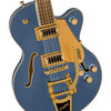 Esta guitarra cuenta con un estilo que roba el escenario con cinco impresionantes acabados (Aspen Green, Azure Metallic, Black Gold, Cadillac Green y Orange Stain) y golpeadores y herrajes dorados relucientes, incluido el cordal de vibrato Bigsby® B70, el puente anclado Adjusto-Matic™ y G. -perillas de flecha.