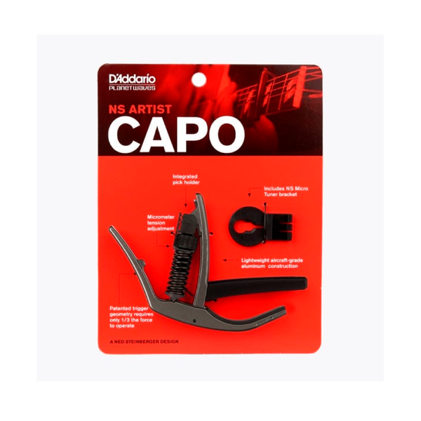 Capo estilo gatillo, diseñado para utilizarse en guitarras eléctricas y acústicas de 6 cuerdas, el ajuste de tensión del micrómetro asegura un rendimiento de afinación libre de zumbidos en cada traste, la geometría del gatillo ofrece un uso fácil y una tensión de sujeción uniforme, construcción ligera de aluminio de grado aeronáutico, incluye soporte de montaje para micro afinador NS (no incluye el afinador).