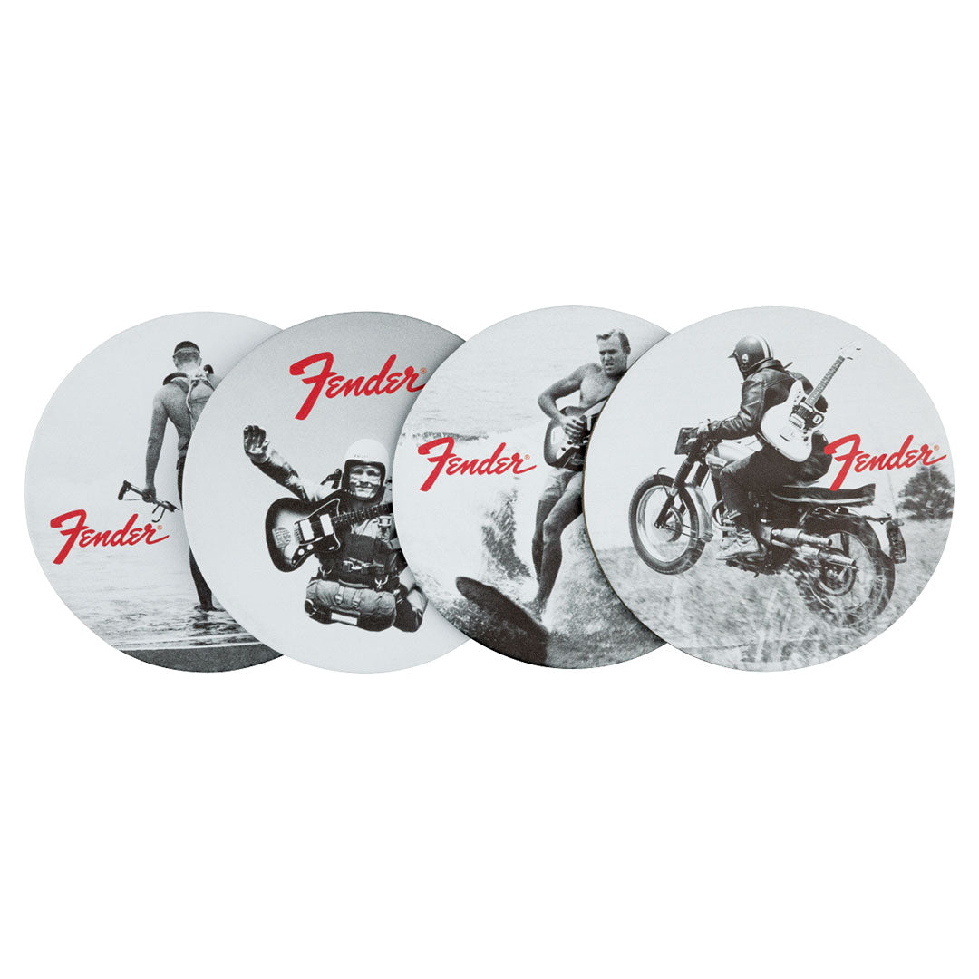 A principios de los años 1960, Fender no dejaba de innovar, pero esta vez en su publicidad. La popularísima campaña de título “You Won't Part With Yours Either” (en inglés, “tú tampoco querrás soltar la tuya”) mostraba a músicos con sus guitarras en las situaciones más inverosímiles, como montando en moto, haciendo caída libre y, por supuesto, practicando surf. Forma parte de nuestro pasado más icónico con este conjunto de cuatro posavasos de piel en los cuales figuran fotografías impresas en blanco y negro. Cada posavasos muestra una foto distinta de aquella campaña publicitaria. Tus bebidas nunca han estado tan adornadas.
