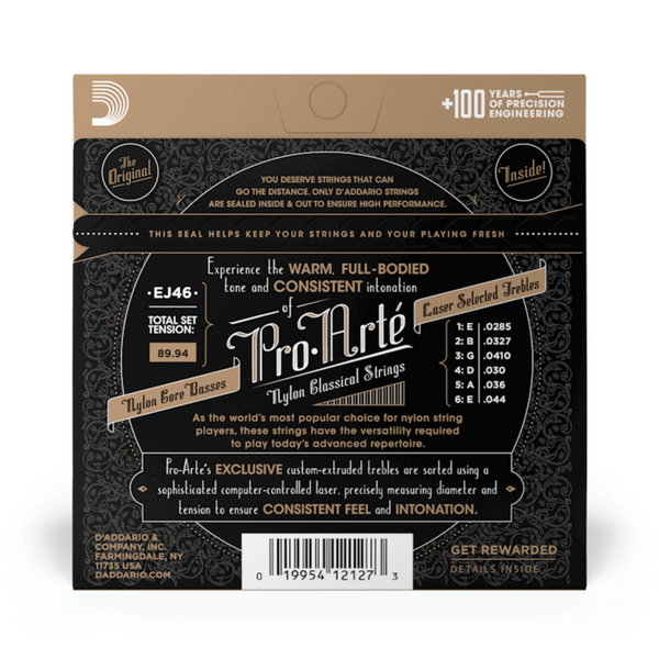 EJ46 es una opción popular por su tono rico, mayor resistencia y fuerte proyección. Todas las cuerdas de agudos Pro-Arté están controladas por computadora con un microscopio láser X-Y que realiza mediciones de diámetro y tensión, asegurando agudos precisos y de verdadero sonido en cada conjunto. Los bajos Pro-Arté se enrollan con cobre plateado en un núcleo de nylon de filamentos múltiples para un tono consistente y cálido, pero proyectante.