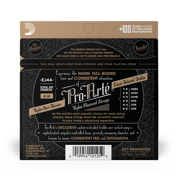 Cuerdas de guitarra clásica/flamenca D´Addario Pro Arte EJ44. Unas cuerdas de gran calidad y tensión extra-fuerte. Todas las cuerdas Pro-Arte son clasificadas por una máquina láser muy sofisticada controlada por ordenador que realiza medidas de diámetro/tensión y control de calidad, asegurando un gran sonido y unos agudos precisos en cada juego. Las cuerdas graves Pro-Arte son entorchadas usando un cobre chapado en plata sobre un núcleo multi-filamentado de nylon para obtener un tono cálido y con mayor proyección.