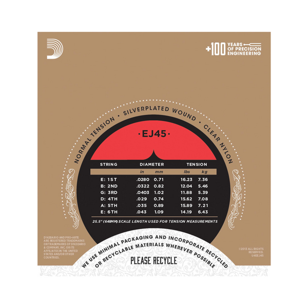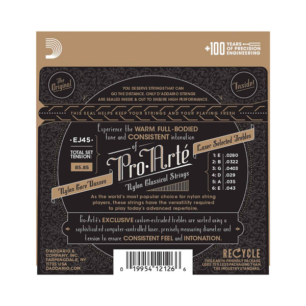 EJ45, tensión normal, es el set clásico más vendido de D'Addario, preferido por su equilibrio de tono rico, sensación cómoda y proyección dinámica. Todas las cuerdas de agudos Pro-Arté están controladas por computadora mediante un micrómetro láser X-Y que realiza mediciones de diámetro y tensión, asegurando agudos precisos y de verdadero sonido en cada set. Los bajos Pro-Arté se enrollan con cobre plateado en un núcleo de nylon de múltiples filamentos para un tono consistente y cálido, pero proyectante.