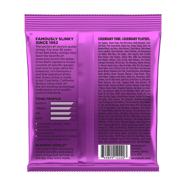Las Power Slinky son uno de los modelos más vendidos de Ernie Ball porque son perfectas para obtener ritmos y tonos gruesos tanto de Blues como de Rock. No en vano han sido las favoritas de Slash, Metallica o Kenny Wayne Shepherd Las Slinky emplean un entorchado de niquel sobre hilo hexagonal para proporcionar el brillo y tensión requerido. Las cuerdas planas utilizan una aleación de carbono de acero para proporcionar un tono perfectamente balanceado. Las Ernie Ball son una de las cuerdas pioneras del Rock and Roll. Desde su irrupción en la industria se ha convertido en un estandar en cuerdas de eléctrica. No en vano, la lista de usuarios de las famosas Slinky ha crecido exponencialmente año a año e incluyen artistas del calibre de Jimmy Page, Eric Clapton, Steve Vai, Slash... Por su calidad contrastada y tono las Slinkys son siempre una apuesta segura.