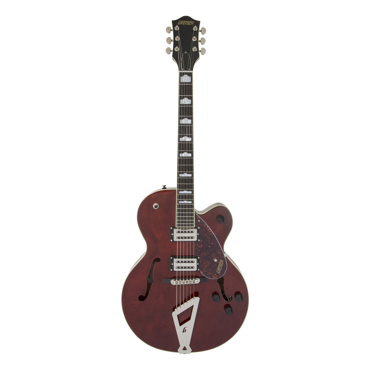 Todo el estilo clásico y llamativo que esperas de Gretsch está aquí: botones de control negros de estilo vintage, orificios en F agrandados para una mayor proyección acústica, elegantes ribetes blancos envejecidos con filetes mejorados, herrajes de níquel de aspecto impecable, construcción arqueada de arce laminado y golpeador de carey de tres capas. Casi imposible de soltar una vez que la tomas y empiezas a tocar, la G2420 es una asombrosa interpretación del sonido auténtico y el estilo clásico que esperas de Gretsch.