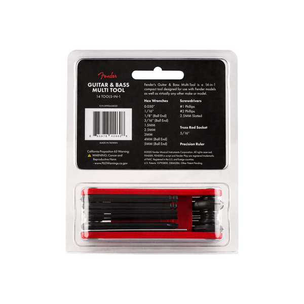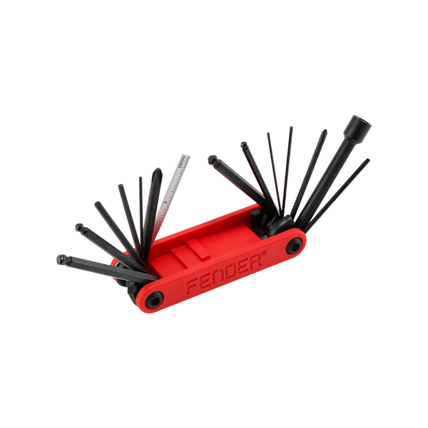 La multiherramienta para guitarra y bajo de Fender es una herramienta compacta 14 en 1 diseñada para usarse con los modelos Fender y prácticamente con cualquier otra marca o modelo. Su cuerpo de una pieza permite la facilidad de uso y rotación, mientras que las llaves hexagonales del tamaño de la barra de armadura incluidas son de punta esférica para un fácil acceso. Con un tamaño estándar y métrico, esta herramienta múltiple sirve como una caja de herramientas en su bolsillo, brindando la máxima funcionalidad para todas sus necesidades de reparación de instrumentos y trabajo técnico.