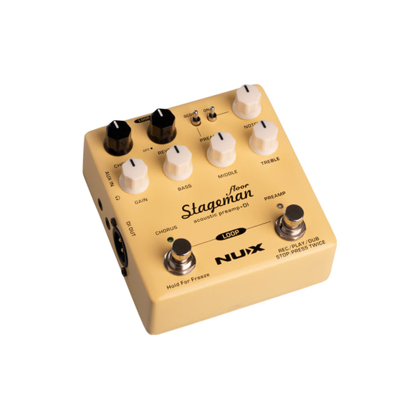 Stageman Floor de NUX es un preamplificador acústico analógico con efectos digitales y función de looper. Es un preamplificador, que cuenta con un ecualizador de 3 bandas altamente sensible con interruptor de palanca MID, un filtro de muesca ajustable y control de ganancia de entrada, proporciona un margen enorme y ofrece un sonido totalmente natural.