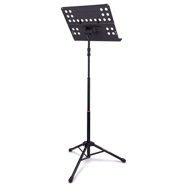 El atril de tres secciones HERCULES BS418B PLUS cuenta con ajuste de altura EZ Grip, un escritorio plegable perforado, una base de trípode plegable y retenedores de páginas de alambre. Clip H incluido.